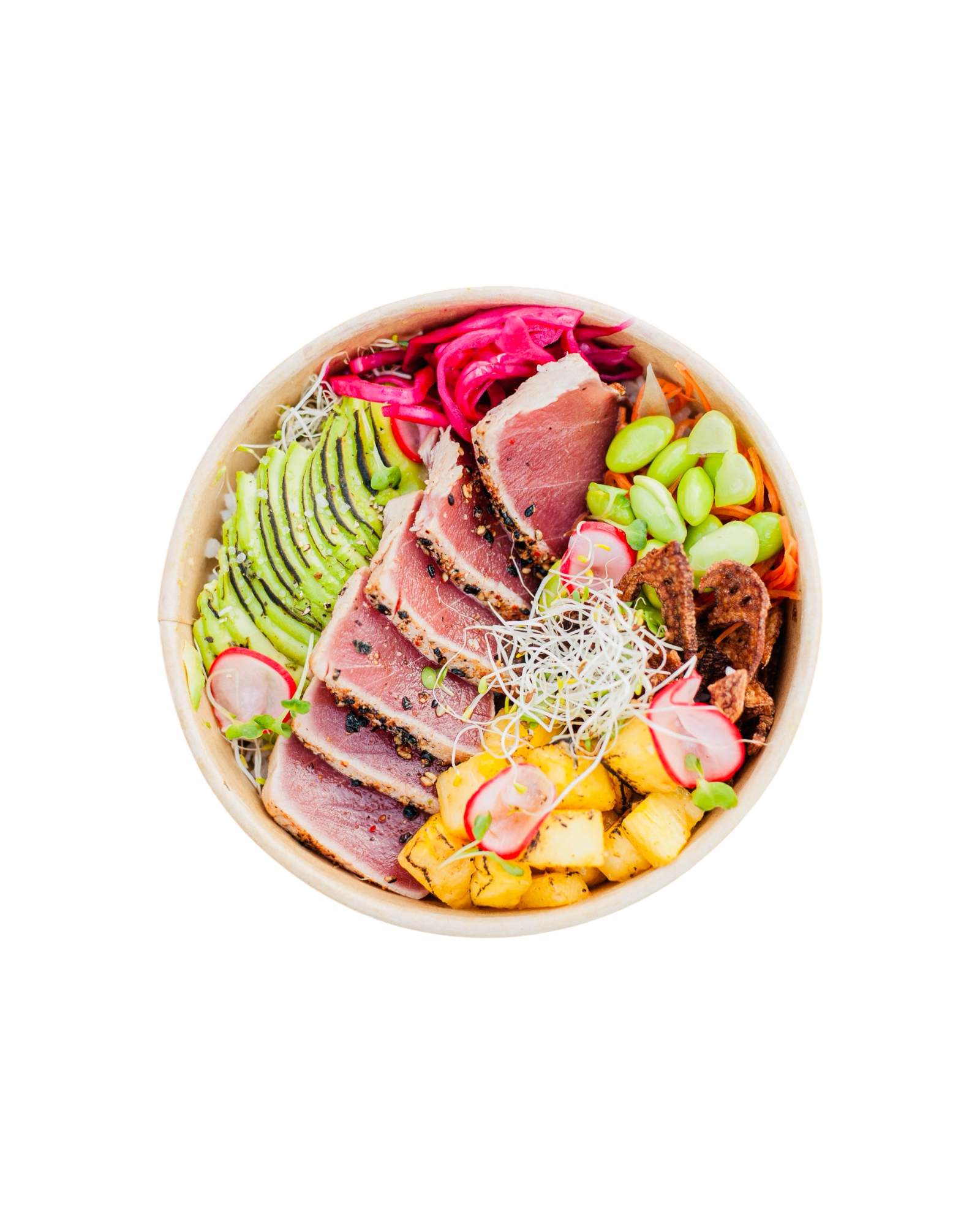 Seared fresh tuna with special sauce over Japanese rice, topped with charred avocado, pineapple, edamame, pickled purple cabbage, and homemade lotus root chips.